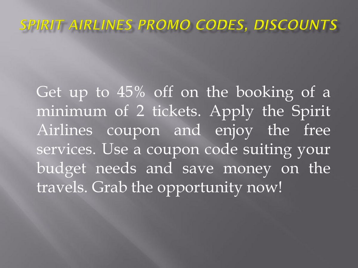 Spirit Airlines Promo Codes, Coupon Code Discounts 2022 Spirit Airlines Coupons & Promo Codes Submit a Coupon Save with 3 Spirit Airlines Offers. 25% OFF Code 25% Off Sitewide Order Added by dealsaver 261 uses today Show Coupon Code See Details FROM $23 Sale Lowest Flight Offers From Spirit Airlines From $23 65 uses today See Details Unpopular Coupons 50% OFF Code 50% Off Flights Added by Shanna615