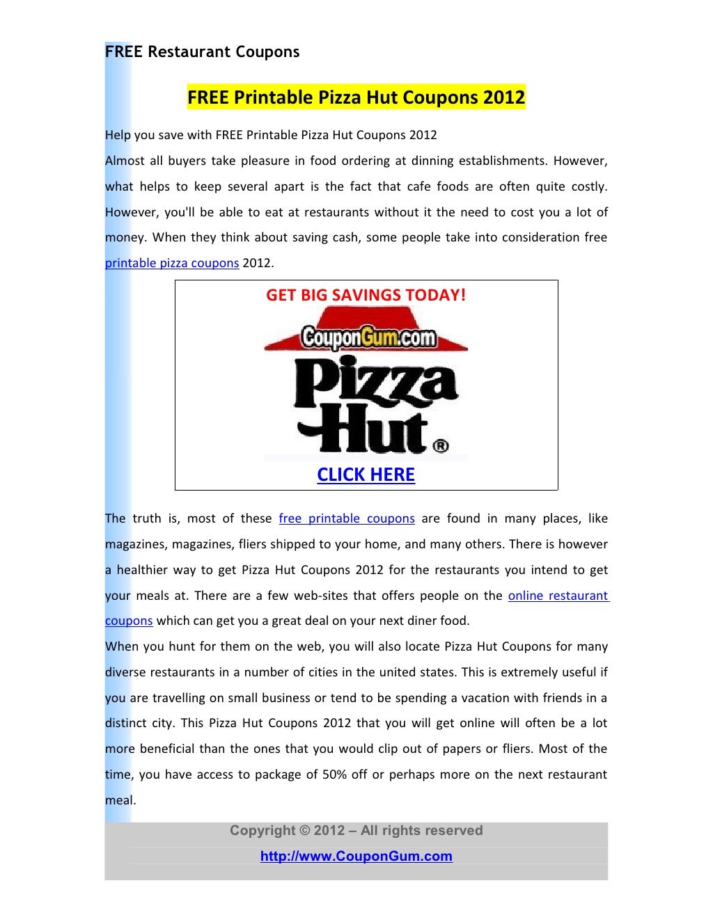 PIzza Hut Coupon - Printable Coupons and Deals This is a great way to coupon at home with ease. Pizza Hut: SUPERBOWL53: 30% off all regular priced items. 7362844: One FREE medium pepperoni pizza LS: large 2-topping pizzas for $7.99 each! Click here to find a Pizza Hut ... At Printable Coupons and Deals, we do our best to post all the printable coupons and deals we can find that will save ...